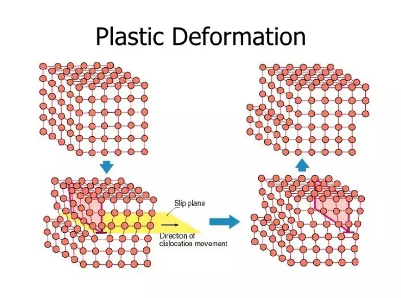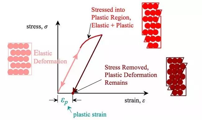 在這一點(diǎn)上,與鄰接的初始原子間的鍵合開(kāi)始破裂并用一組新的原子進(jìn)行改造。當(dāng)這種情況發(fā)生時(shí),應(yīng)力被卸除后材料將不再恢復(fù)到原來(lái)的狀態(tài),即變形是永久的和不可恢復(fù)的。這時(shí)材料進(jìn)入塑性變形區(qū)(圖1)。
