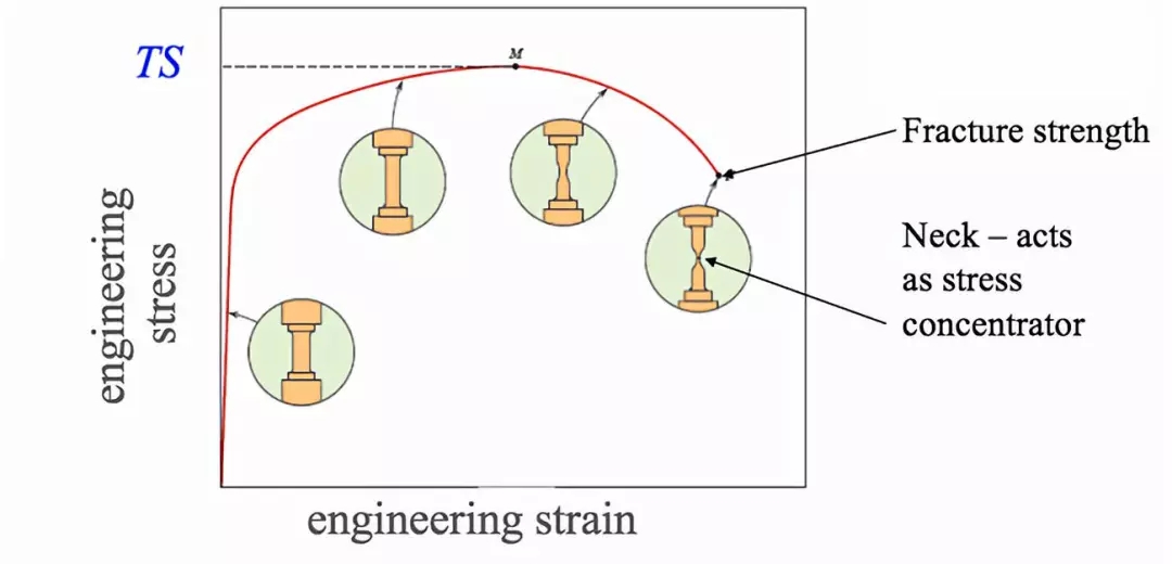 繼續(xù)增加應(yīng)力,曲線達(dá)到較大值。較大值對(duì)應(yīng)抗拉強(qiáng)度,這是曲線的較大應(yīng)力值,由圖中的M表示。斷裂點(diǎn)是材料較終斷裂的點(diǎn),由圖中的F表示。