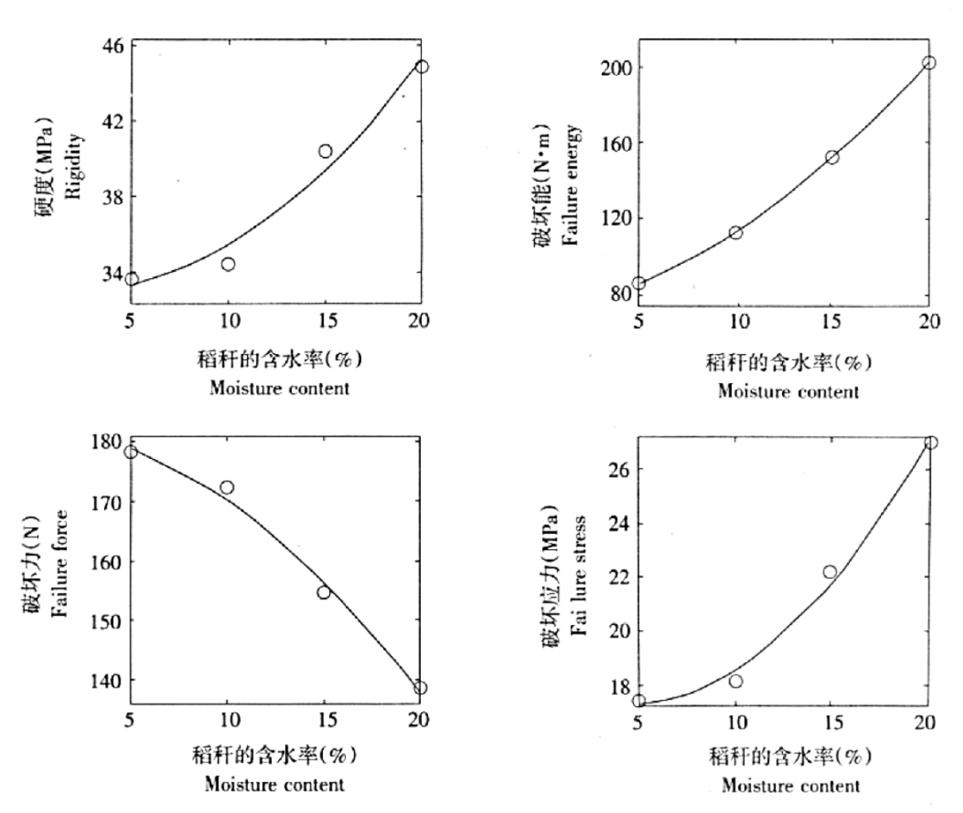 測(cè)定和研究稻草秸稈中的機(jī)械特性可以為其機(jī)械加工設(shè)計(jì)提供理論參數(shù),東北農(nóng)業(yè)大學(xué)的孫占峰和華南農(nóng)業(yè)大學(xué)的蔣恩臣使用萬(wàn)能試驗(yàn)機(jī)對(duì)稻草秸稈進(jìn)行了壓縮、彎曲和剪切試驗(yàn)。試驗(yàn)包括橫向壓縮、軸向壓縮和剪切試驗(yàn)、彎曲試驗(yàn)三大類。其中分別對(duì)根部莖稈、下部節(jié)莖稈、中部莖稈、上部節(jié)莖稈、稍部莖稈進(jìn)行測(cè)試和數(shù)據(jù)處理。試樣的物理特性參數(shù)包括外徑、內(nèi)徑、橫斷面面積、含水率等。試驗(yàn)中試樣的變形范圍為0~10 mm,力的變化范圍為0~100 N。通過(guò)計(jì)算機(jī)自動(dòng)采集數(shù)據(jù)可直接得出力-變形曲線。作者在較后通過(guò)多項(xiàng)式回歸還分析建立了稻草秸稈的擠壓、彎曲和剪切力學(xué)指標(biāo)隨含水率變化關(guān)系的數(shù)學(xué)模型。